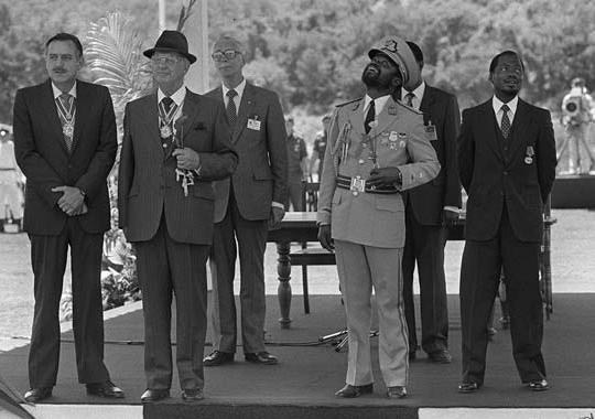 Em primeiro plano e do lado esquerdo aparecem o Ministro dos Negócios Estrangeiros sul-africano Roelof Pik Botha e P.W. Botha, ambos de condecoração ao pescoço
